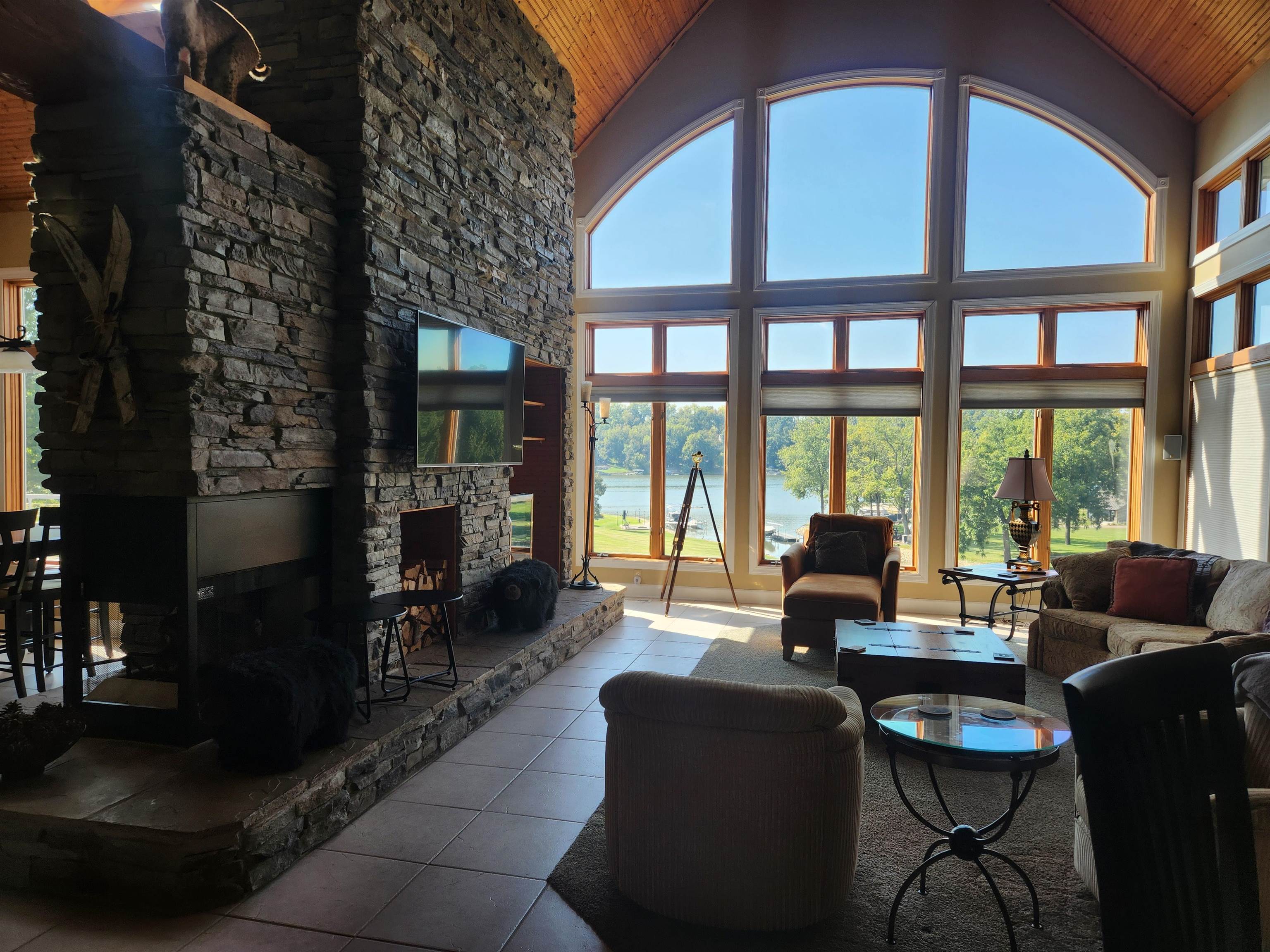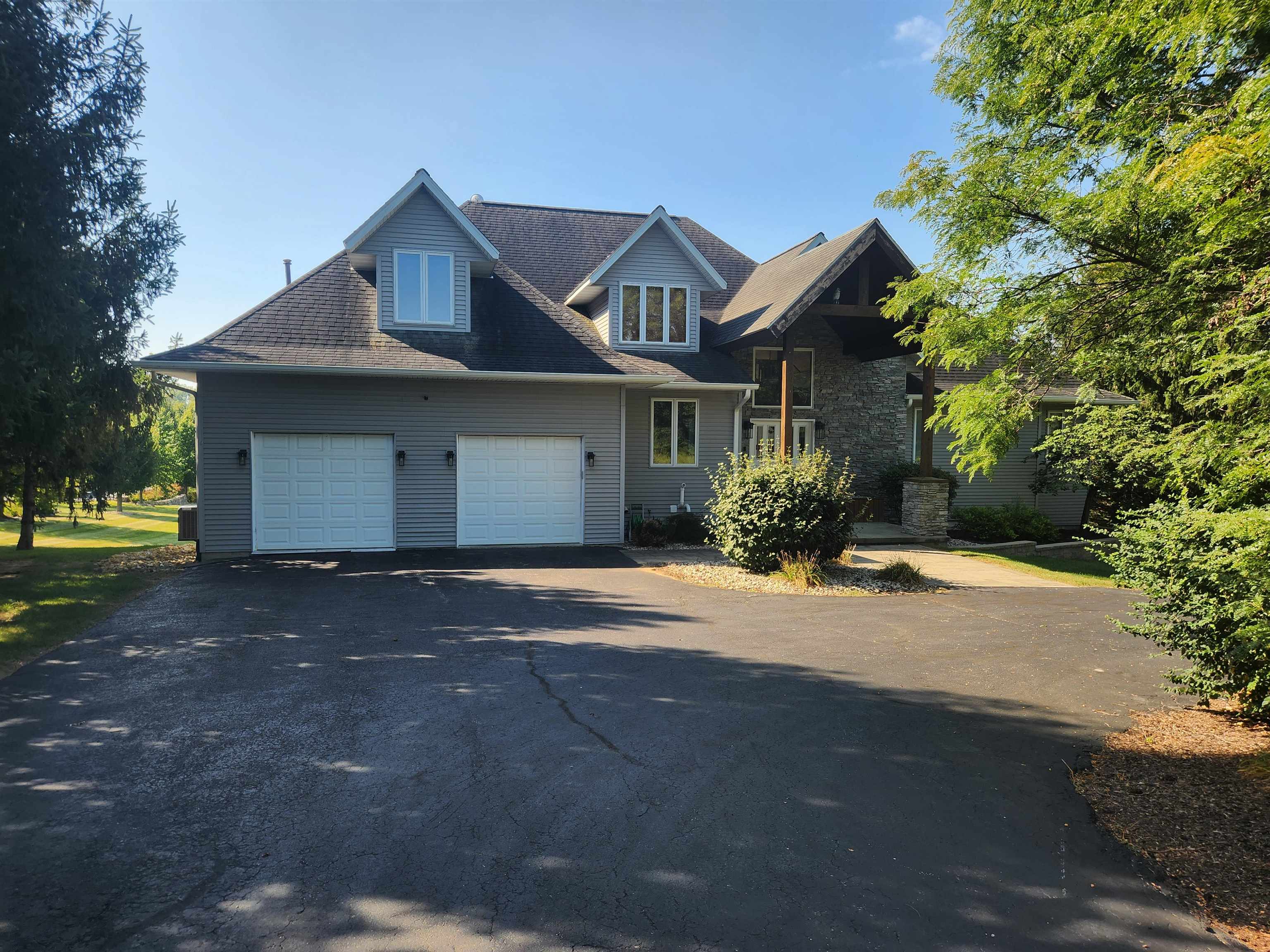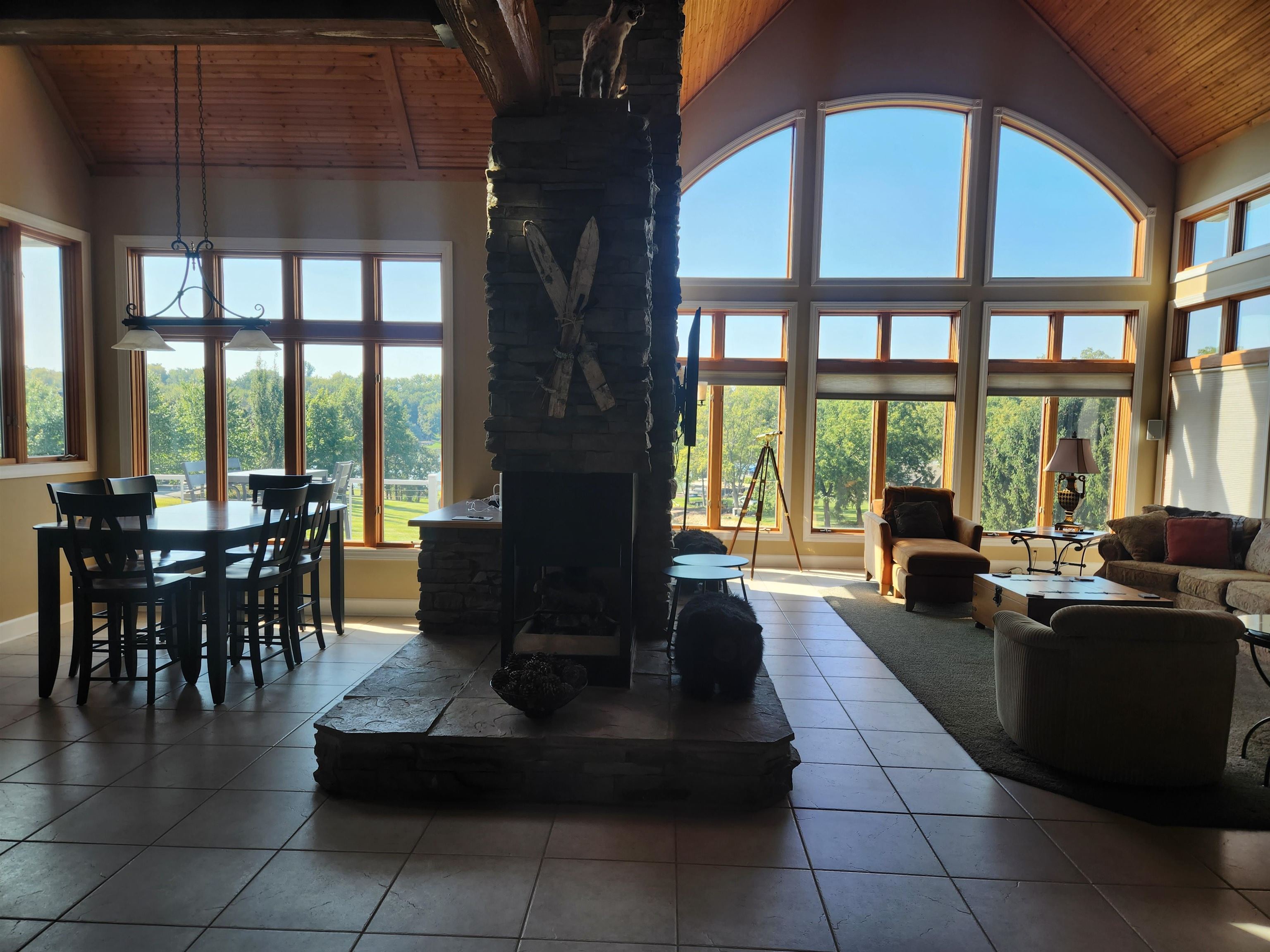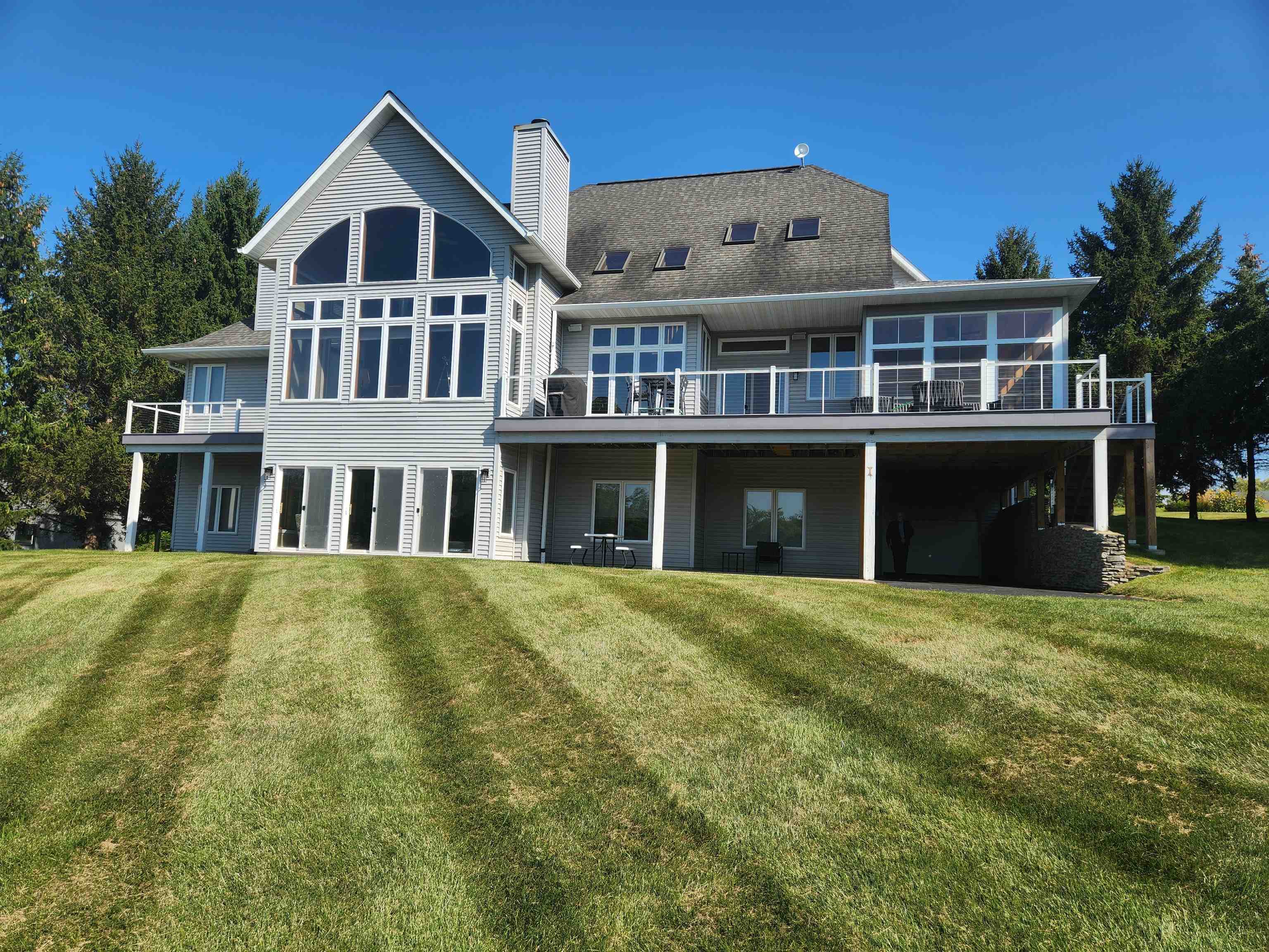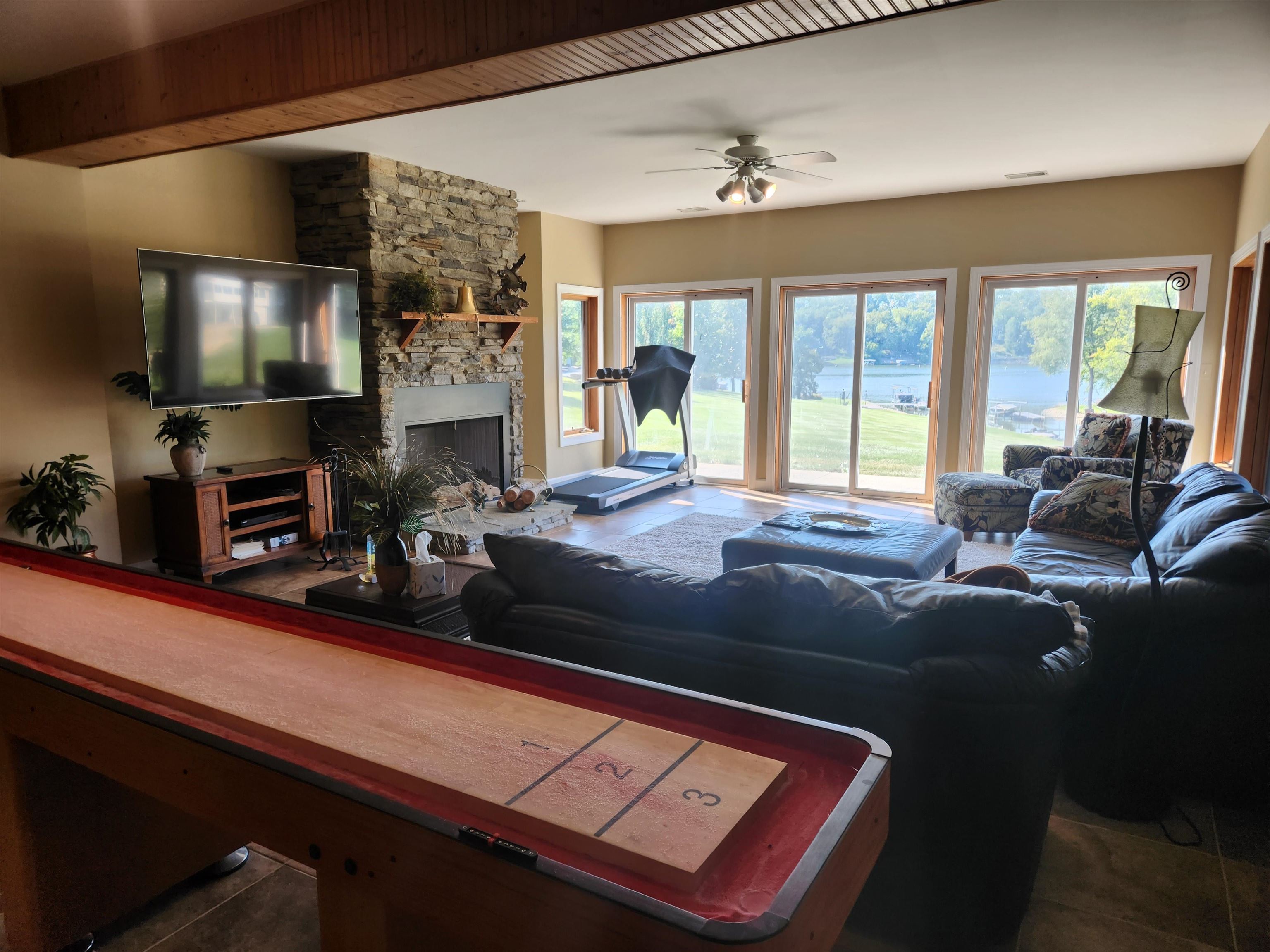 Welcome to this stunning Lake Carroll waterfront retreat! Situated on 1.67 acres with 157 feet of shoreline, this 6-bedroom, 3.5-bath home offers over 5,400 sq ft of living space and gorgeous lake views throughout. The main level features an open-concept design with a spacious living room, dining area, and a kitchen with a breakfast bar for six. A striking 3-sided fireplace is the centerpiece of this space. The primary suite is privately tucked on one end of the home, complete with its own fireplace, full bath with dual vanities, jetted tub, and walk-in shower. A powder room and a generous laundry/mud room complete the main level. Enjoy the outdoors from the maintenance-free decking or the expansive 3-season porch—perfect for entertaining. Upstairs, the loft offers flexible space for a sitting area or home office, along with two guest bedrooms, including a second master suite with a private full bath. The walkout lower level provides even more space for gathering with a large family room and wood-burning fireplace, kitchenette/bar area, rec/game room, three guest bedrooms, and a full bath. Both the family and game rooms open to the lower patio and beautifully landscaped yard. Storage and convenience abound with a 2-stall garage on the main level and an additional 2 stalls below—ideal for all your lake toys. This property combines comfort, style, and functionality in a truly beautiful setting. Don’t miss the chance to make this lakefront gem your own!